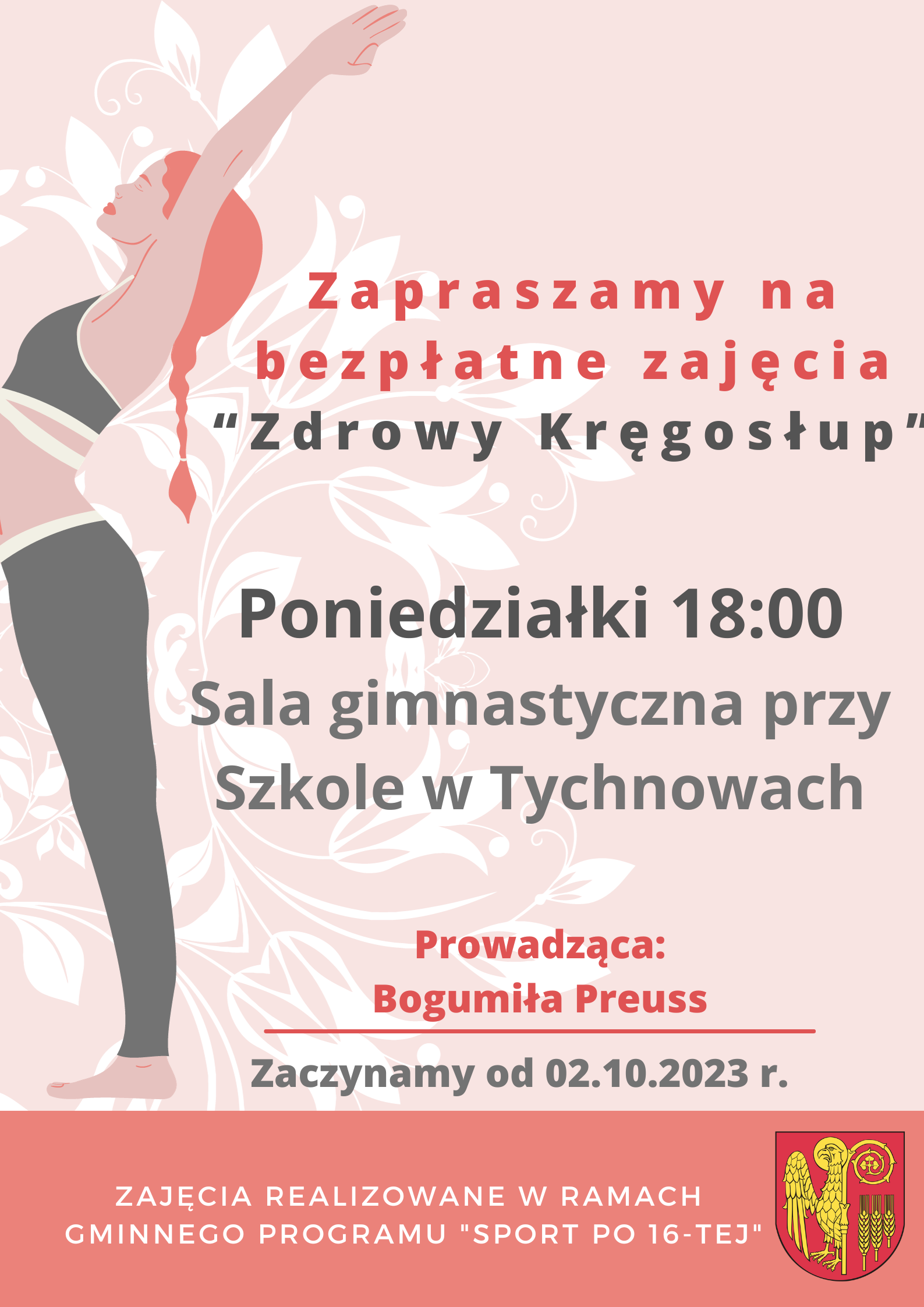 Serdecznie zapraszamy Mieszkańców Gminy Kwidzyn na bezpłatne zajęcia "Zdrowy Kręgosłup". Zajęcia poprowadzi Pani Bogumiła Preuss w każdy poniedziałek na godz. 18:00 w sali gimnastycznej przy Szkole Podstawowej w Tychnowach. Zaczynamy od 02.10.2023 r.