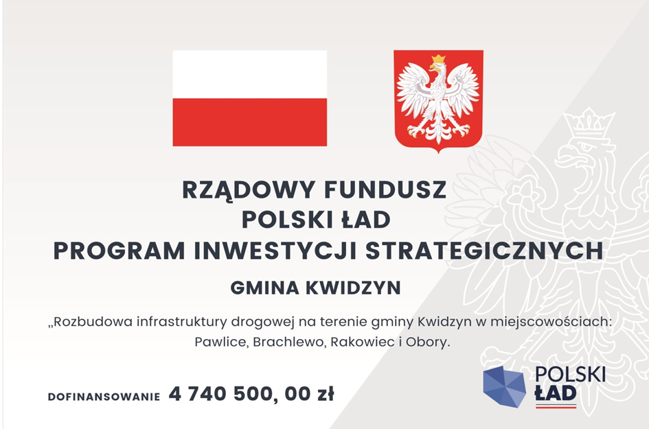 Gmina Kwidzyn w Ramach Rządowego Funduszu Polski Ład otrzymała dofinansowanie na inwestycję pn.: „Rozbudowa infrastruktury drogowej na terenie Gminy Kwidzyn w miejscowościach Pawlice, Brachlewo, Rakowiec i Obory”