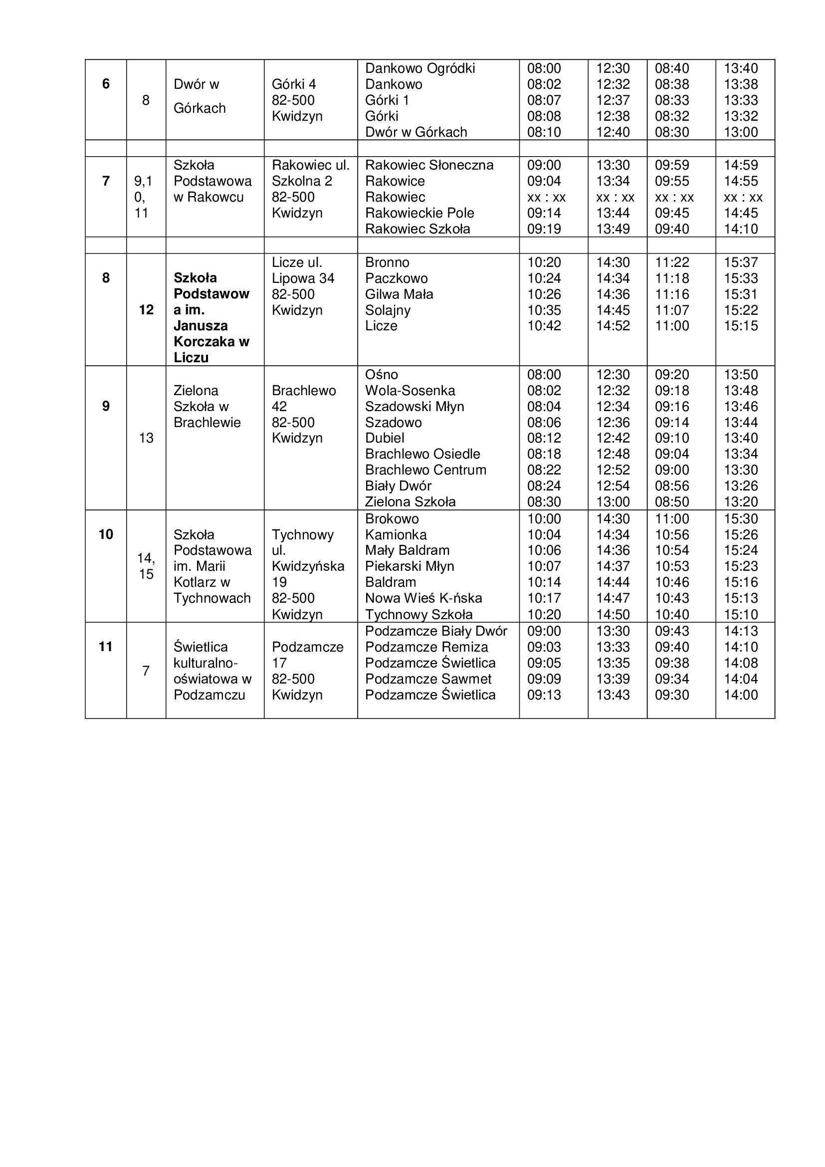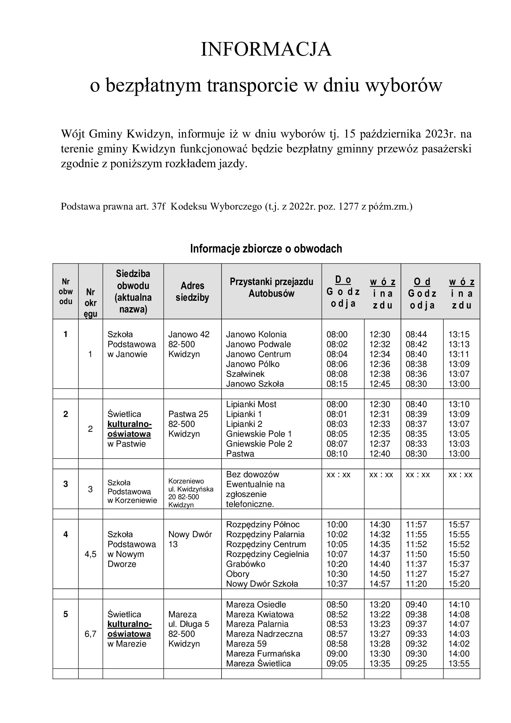 Wójt Gminy Kwidzyn, informuje iż w dniu wyborów tj. 15 października 2023r. na terenie gminy Kwidzyn funkcjonować będzie bezpłatny gminny przewóz pasażerski zgodnie z poniższym rozkładem jazdy.