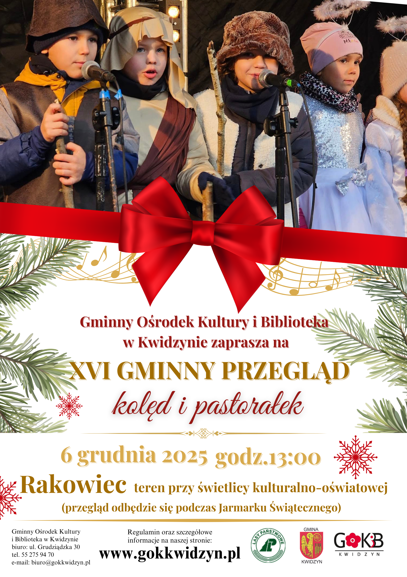 Gminny Ośrodek Kultury i Biblioteka w Kwidzynie serdecznie zaprasza dzieci, młodzież, dorosłych, zespoły dziecięco–młodzieżowe oraz ludowe zespoły śpiewacze z gminy Kwidzyn do udziału w XVI Gminnym Przeglądzie Kolęd i Pastorałek, który odbędzie się podczas Jarmarku Świątecznego – 6 grudnia 2025 r. w Rakowcu!
